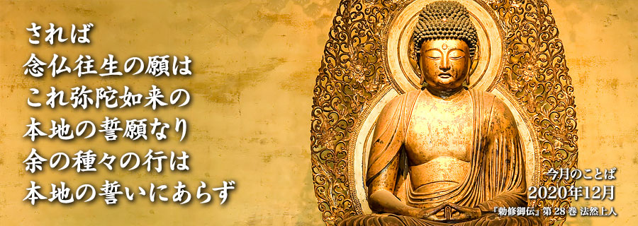 今月のことばは法然上人のお伝記である『勅修御伝』28巻より選びました。内容は、念仏往生の願は阿弥陀様が法蔵菩薩であった時(本地)の願いなのです。念仏以外の様々な修行はその時の願いではありません、となるでしょう。